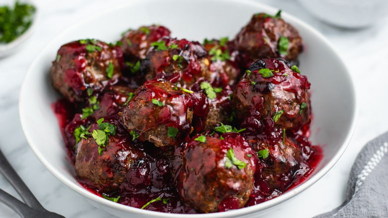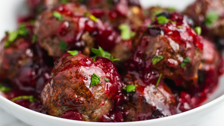 These cranberry meatballs would be a solid holiday dinner party appetizer, and they would also be fun bites to enjoy at home on football Sunday. The possibilities are truly endless when it comes to this meaty treat, and we have recipe developer Catherine Brookes to thank for that. "I love how this festive twist pairs so well with fresh homemade meatballs," Brookes raves. "With cranberries both mixed into the meatballs themselves and as the base of the sticky glaze, this dish is packed with flavor!" Speaking of flavor, Brookes has a great description for that as well: "The flavor is a great mix of savory, sweet, and sharp. You get the richness of the meat and the fruitiness of the cranberry." Keep reading to find out how to make this incredible dish!