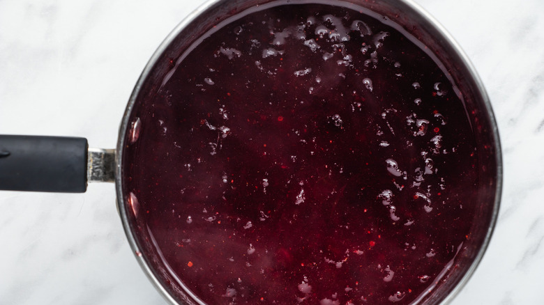 Now, take out a medium saucepan, and add the ingredients to make the glaze that goes on top of the meatballs. This includes cranberry sauce, orange juice, brown sugar, and cayenne pepper. Turn the heat up to medium, and cook until it starts to boil. Be sure to stir frequently as you go so nothing burns or sticks to the bottom of the saucepan. "It shouldn't take long, no more than five minutes," Brookes shares. "You really just want to mix together all the ingredients, then warm it up."