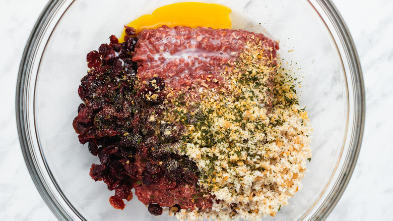 - Add the minced beef, egg, milk, breadcrumbs, onion powder, garlic powder, dried parsley, salt and pepper to taste, and dried cranberries to a large mixing bowl. Mix everything together using your hands until well combined.