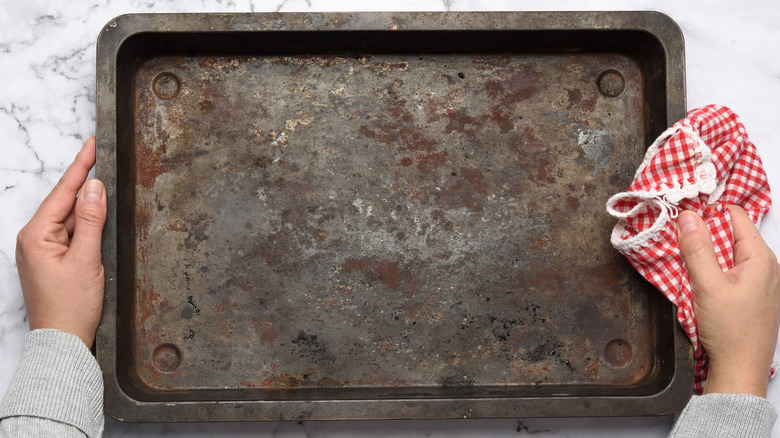 Then, take out a baking sheet, and add some oil. This is a great thing to do so your meatballs won't stick to the bottom of the pan, and it also makes cleaning up the pan a whole lot easier when you're done.