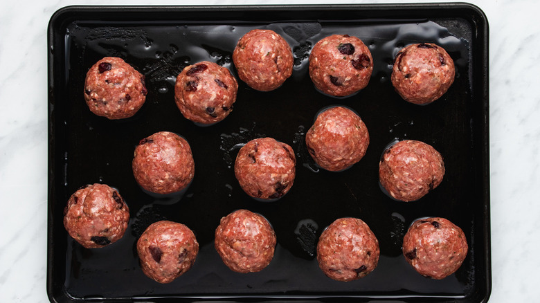 Then, drizzle olive oil over the top of the meatballs. "It helps to get them nice and brown all over," Brookes shares of the olive oil. Then, pop the meatballs in the oven for 20 to 25 minutes, and bake until browned and fully cooked through.