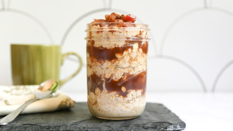 In a mason jar, add ⅓ of the oatmeal, followed by ¼ cup apple butter and then ⅓ of the apples. Repeat once more.