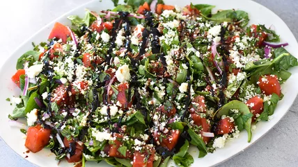With just 15 minutes of prep and 20 minutes of cooking, you can have a truly unique salad that combines that familiar sweetness of watermelon with the surprisingly complex flavor combination of balsamic vinegar, baby spinach, mint, and cotija cheese. Yes, cotija. "Cotija has a more mild flavor than parmesan or feta," Rapone explains, "so I think it does a great job letting the watermelon and herbs really shine."