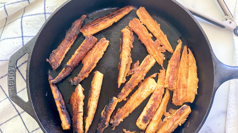 - Heat the 1/12 cup of oil in a frying pan, and when it is hot, add in the battered baby corn and cook for about 4 minutes on each side.