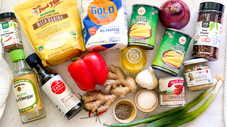 There's a lot that goes into this recipe, but don't worry, it really is manageable when you go step by step. You'll need canned baby corn, all-purpose flour, cornflour, ground ginger paste, chili powder, salt, pepper, water, oil, chopped Thai chilis, minced ginger, minced garlic, chopped scallions, chopped red pepper, chopped onion, tomato sauce, soy sauce, rice vinegar, and red pepper flakes for topping.
