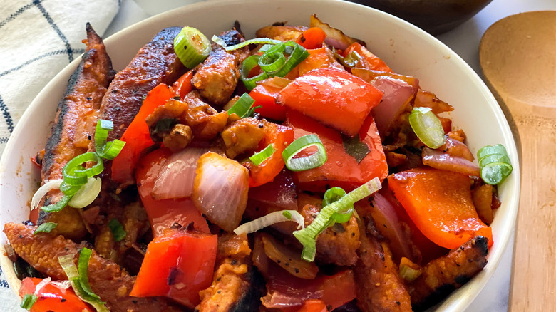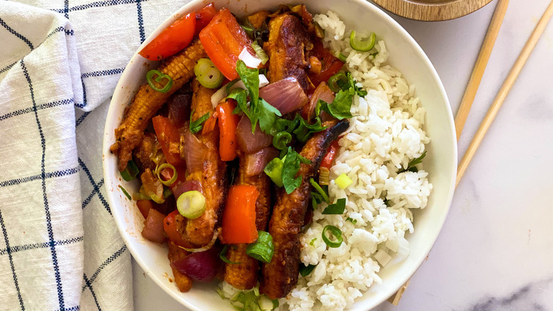For the last step, add the cooked corn to the frying pan with the vegetables, and mix well to combine everything. Now transfer to a bowl or platter and serve your masterpiece, which goes well with rice. "It is also really good served over rice noodles," said Hahn, adding: "It is a great as side dish with lots of flavor!"