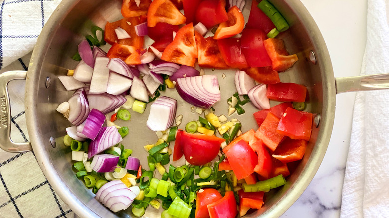 While the corn is cooking (or once it's done if you dislike multitasking in the kitchen), chop up the onion, scallions, red pepper, garlic, and fresh ginger. Then heat up the remaining tablespoon of oil and sauté the red pepper, onion, garlic, ginger, and scallions in a pan, cooking the veggies for about five to eight minutes on medium-high heat, stirring often.