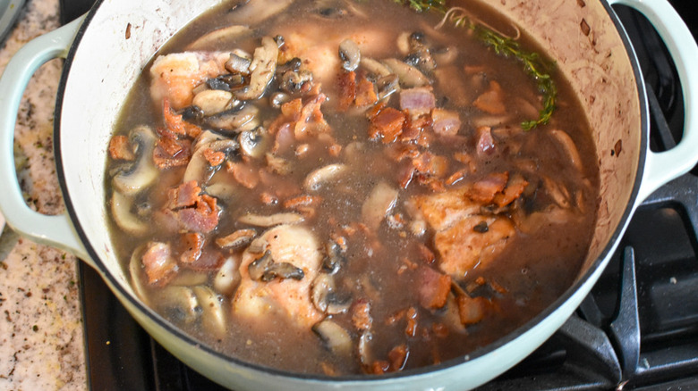 - Add the rabbit, mushrooms, bacon, thyme bundle, chicken stock, and ½ teaspoon black pepper to the pot and stir.