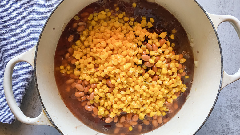 - Add the pinto beans, black beans, corn, tomatoes, and tomato sauce.