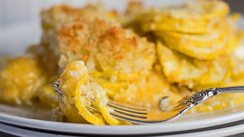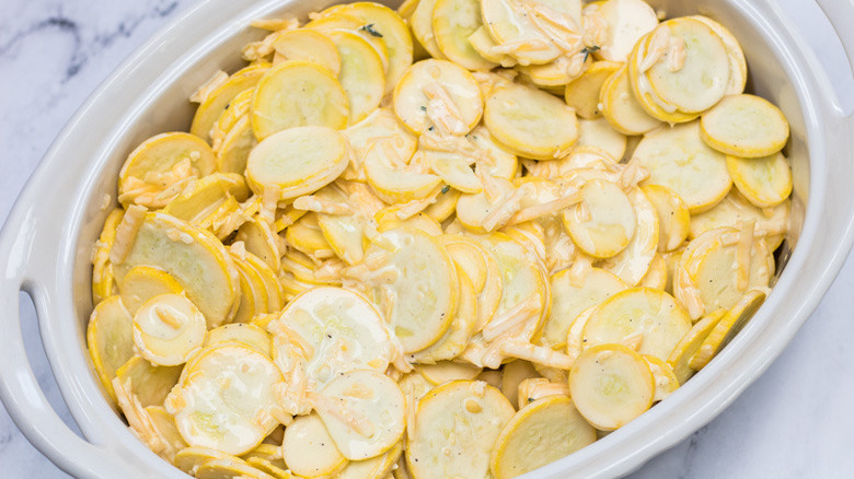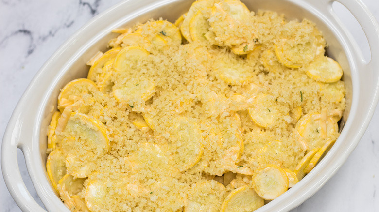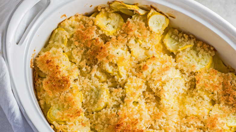 One of the most common problems people run into when making squash casserole is ending up with a dish that's overly watery. No one likes a soggy casserole, right? If this happens to you, the issue likely has to do with the star ingredient: the squash itself. Fortunately, there are some ways to prevent this.