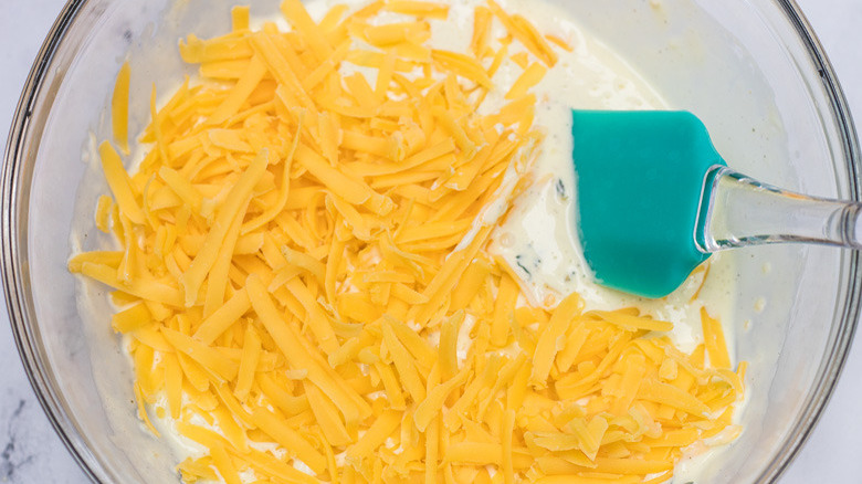 - Fold in the grated cheddar cheese.