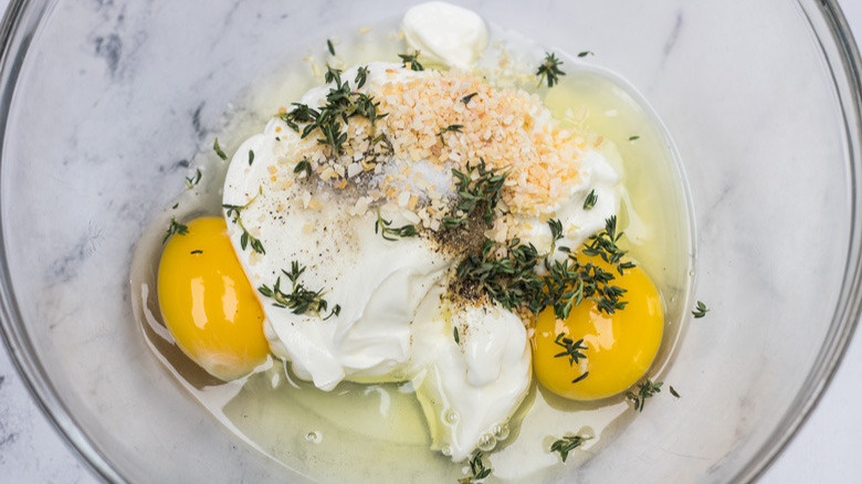 - In a medium mixing bowl, combine the sour cream, eggs, fresh thyme, salt, and pepper.