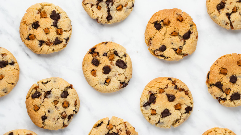 Most of the ingredients you'll need for these cookies may be items you already have on hand. You'll need two types of sugar, both white and brown. As Brookes tells us, "I generally add brown sugar to cookies as it gives a bit more of a caramel flavor." You'll also need butter, an egg, vanilla extract, flour, salt, and baking soda. For chocolate chips, you'd use the standard semi-sweet kind. If there's one thing you may need to run out to the store for, it's likely to be toffee chips, but you should be able to find these in the baking aisle alongside the chocolate chips.