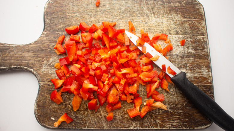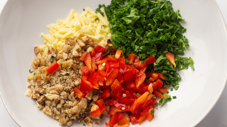 - Get a chopping board and chop the walnuts, curly parsley, red pepper, and chives into smaller pieces.