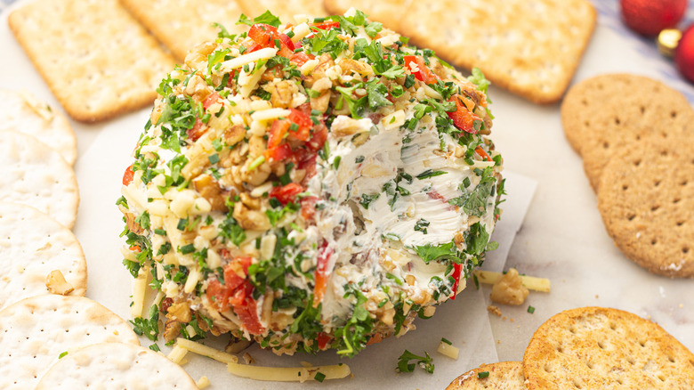 - Once the cheese ball is covered in the ingredients, serve it with crackers.