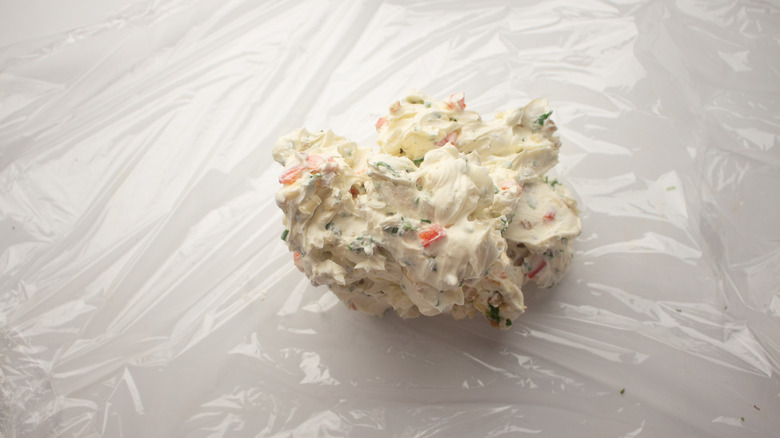 Now, spoon the cream cheese ball into a plastic cling wrapper and form a circle with cheese. You should just be able to form it with your hands or roll it on the counter to make a ball. Wrap the cheese up tightly and put it in the fridge for 2 hours. Once your 2-hour timer buzzes, remove the cheese from the refrigerator. Olayinka says that you should chill the cheese ball ahead of time, "so it hardens." That makes sense to us! The harder the cheese ball, the easier it will be to work with. Let's be honest — who wants warm cheese?