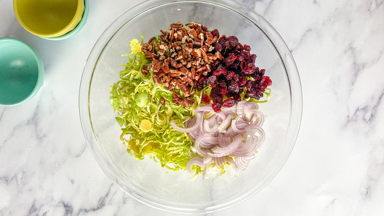 - In a large mixing bowl, combine the shredded Brussels sprouts, shallot, dried cranberries, pecans, and the dressing.