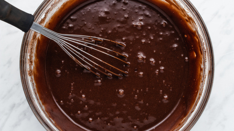 Once you have finished all of your dry ingredients, we can move onto the wet ones, as is common in most baking recipes. At this time, toss in the milk, oil, and eggs. For a little bit of sweetness, you can also drizzle in the vanilla extract. You will only need a bit of vanilla extract, but trust us when we tell you that a little bit goes a long way. Keeping along with the same theme, grab your whisk and mix everything one more time until it's just combined. Then, add the boiling water slowly. Whisk as you go until it's all combined — and just like that, you have your bake batter!