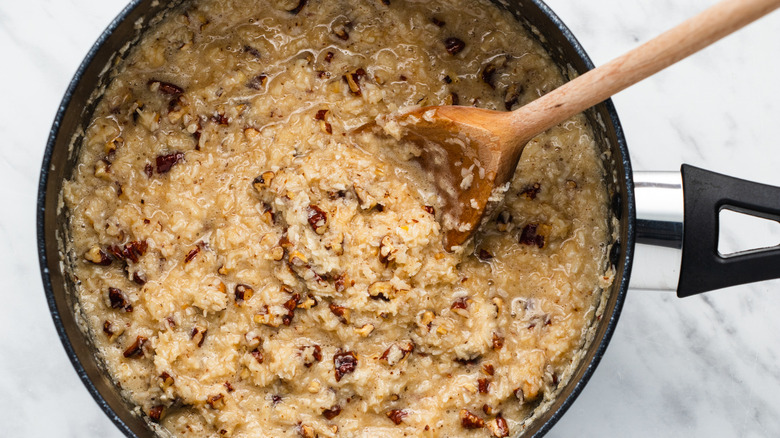 - Remove the pan from the heat and add the pecans, coconut, and vanilla extract. Stir everything together and set aside to cool. It will thicken slightly as it cools.