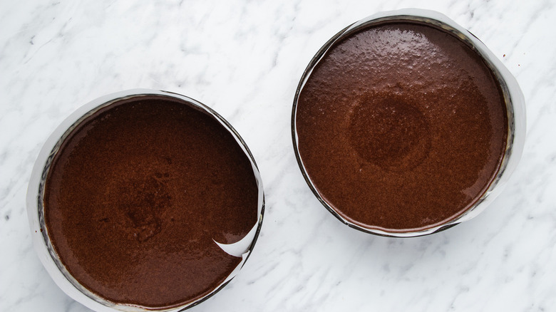 - Evenly distribute the mixture between your prepared cake pans. Bake for 35 minutes or until a skewer inserted into the center of a cake comes out clean.