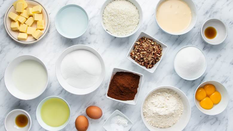 The first step in the process is to gather all of the necessary items that you will need to throw together this cake. Start with a few cups of flour, and then grab some cocoa powder. You will also need some baking soda and baking powder. In addition, be sure to pick up some salt, sugar, and vegetable oil. Then, pop by the dairy aisle and get some milk and eggs. Additionally, the recipe calls for boiling water, but you should have that at home already. Be sure to get evaporated milk, unsalted butter, vanilla extract, and shredded coconut. Last but not least, you will need some pecans for the topping.