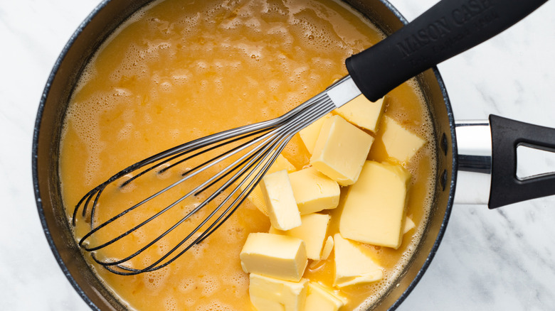- Add the butter to the pan and heat on a low-medium setting, whisking constantly until the butter has melted. This will take about 10 minutes.