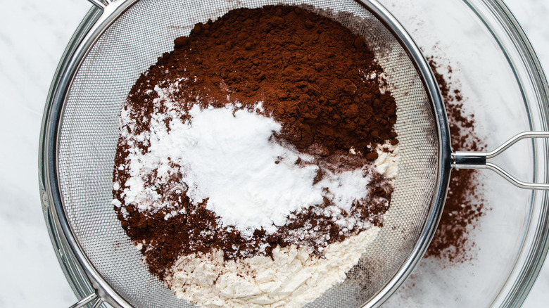 While you wait for your oven to preheat, there is more to do, so let's get right into it. Take out a mixing bowl and start to add your dry ingredients. Start with the flour and cocoa powder. Be sure to use a sifter when you pour each one into the bowl. "Sifting ensures there are no lumps which helps everything to combine more smoothly," Brookes shares. Continue adding dry ingredients to the mixing bowl, including the baking powder and the salt. Whisk all of the dry ingredients together to combine. Then, add the sugar and whisk again.