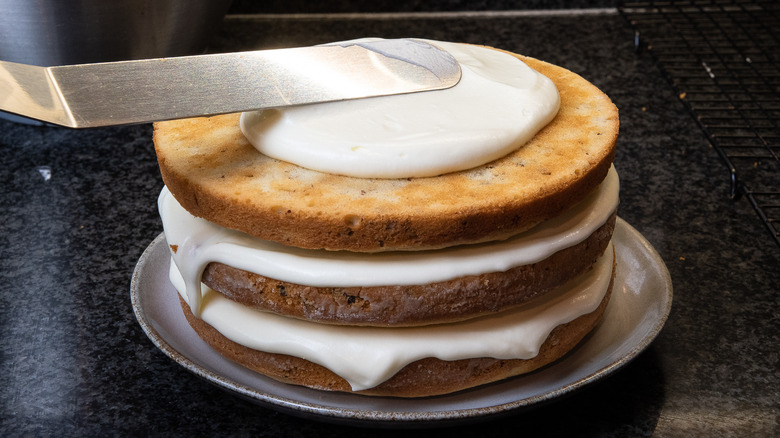 - Spread the frosting evenly across the sponge before adding the second and then the third sponges, and repeating the process.