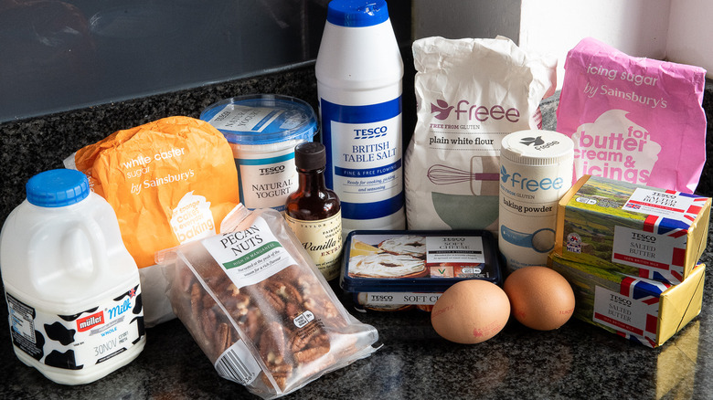As noted, it takes a good number of ingredients to make this cake, and they include: pecans, both salted butter and unsalted butter, all-purpose flour, baking powder, granulated sugar, a couple large eggs, vanilla extract, natural (unflavored) yogurt, whole milk, cream cheese, and lots of powdered sugar.