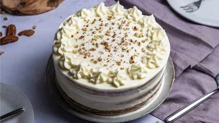 When the cakes are completely cooled, place the first sponge on a plate or cake stand, and spoon 2 tablespoons full of the cream cheese frosting on top of the sponge. Spread it evenly across the sponge before adding the second and then the third sponges and repeating the process. Use a little more of the cream cheese frosting around the sides of the cake, and, with a piping bag, pipe some around the top for decoration. Decorate the top with whole or chopped pecans.