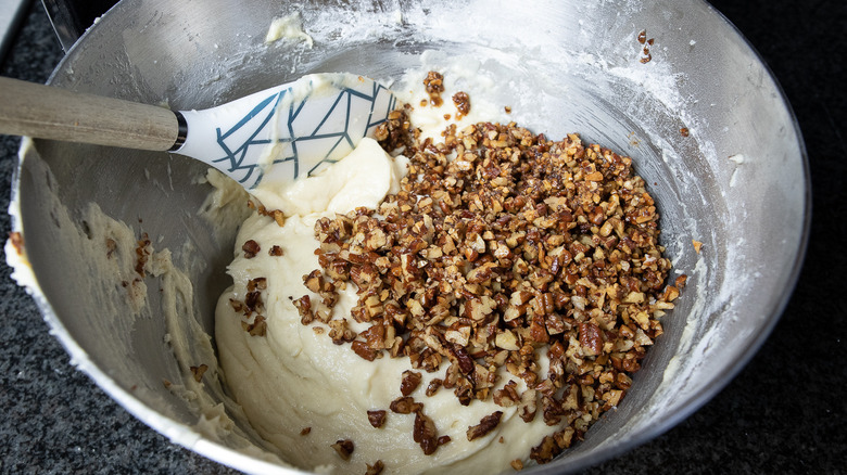 - Gently fold in the buttered pecans until just combined, then divide the batter evenly between the three prepared cake tins.