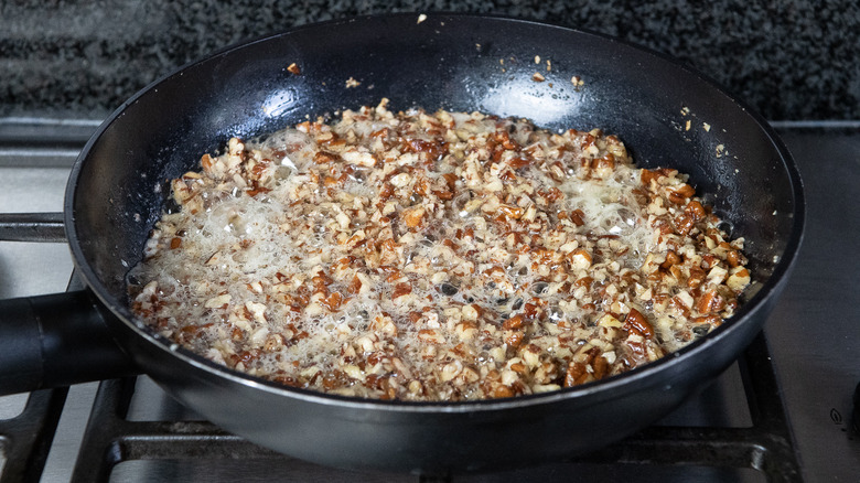 - In a pan, melt the salted butter along with the 1 cup of finely chopped pecans. Sauté the mixture for 3 to 4 minutes, until the pecans are slightly colored.