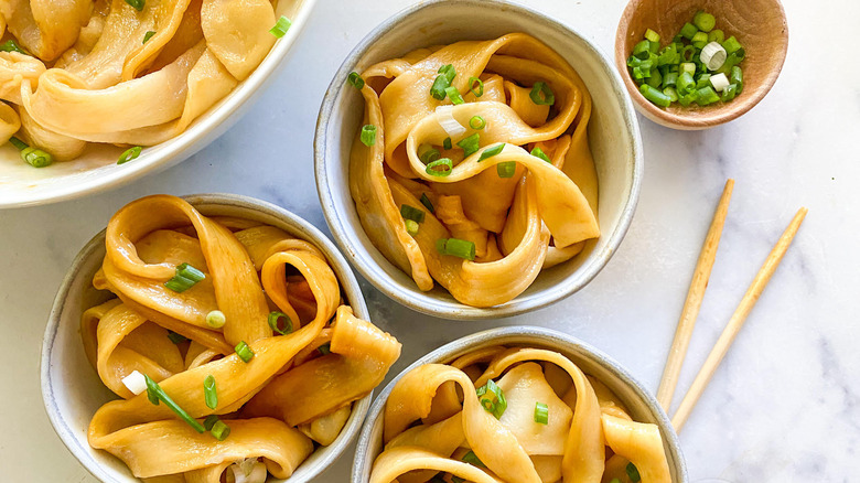 This dish is super versatile, and you could make it with a variety of different sauces, depending on what you're in the mood for. Whether you like Italian, Asian, or any other style of noodles — this recipe has you covered. Recipe developer Miriam Hahn is the brain behind this fantastic recipe that is sure to be a new favorite. "I love being able to make noodles at home that are super fresh without a pasta machine," she raves. "They are so soft and delicious and are totally different from boxed noodles. And these are ingredients that everyone has in the house!"
