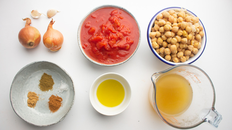 Before you can dive into making this Moroccan chickpea stew, you'll want to make sure that you have the right ingredients on deck. For this recipe, you'll need garlic cloves, a yellow onion, extra-virgin olive oil, a can of diced tomatoes, a drained can of chickpeas, and vegetable stock. As for seasoning, this recipe keeps it simple but flavorful with cumin, ginger, and cinnamon. While chickpeas are a crucial part of this recipe, Olayinka does note that you could sub them for either black beans or lentils. Or, you could throw some beans in alongside the chickpeas for extra flavor and protein!