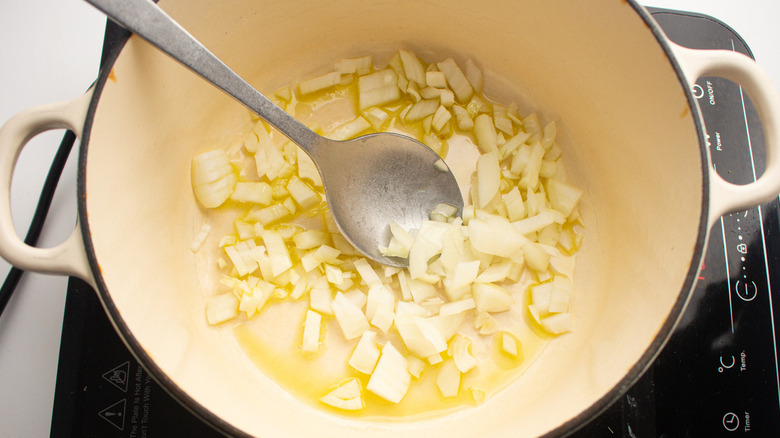As with many soup or stew recipes, it all starts with the basics, which is sautéing the onion and garlic. For starters, be sure to finely mince your garlic cloves, and chop the onion. Then, grab a pot or Dutch oven that will be big enough to accommodate all of the stew, and put it onto your stovetop on medium-high heat.