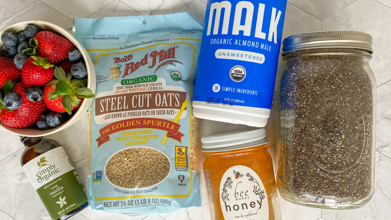 Now that you know you'd like to make this dish, the first thing you will need to do is head to the grocery store. Before you go, check your pantry and fridge for items that you may have at home already. Luckily, this recipe is pretty simple, and you will only need a handful of items. Start with a cup of steel cut oats, followed by some almond milk. In addition, be sure to grab some vanilla extract and honey. Next, you will need some chia seeds and mixed berries for garnish.