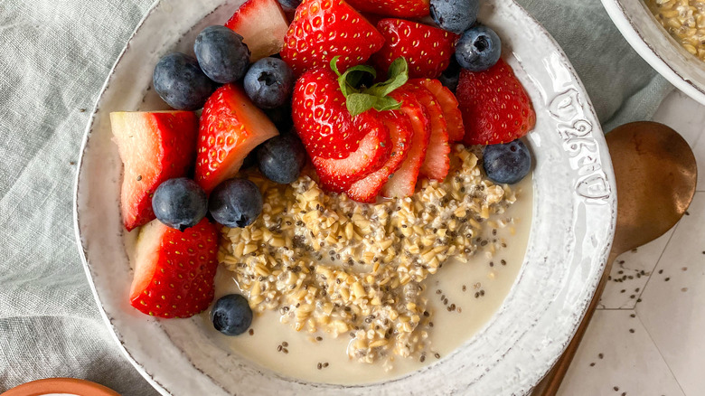 Another great part? It's healthy! "This whole recipe is so full of fiber and many important vitamins and minerals! The steel cut oats especially are high in manganese and phosphorus, and the chia seeds are an amazing source of omega-3 fatty acids," MacLean explains. "Eating a serving of these steel cut overnight oats for breakfast a few times a week can help improve heart and digestive health and may support weight loss!" Keep reading to find out how to make this yummy breakfast.