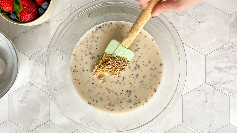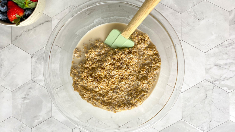 Now that you have all of your ingredients in front of you, take out a large mixing bowl, and start combining. First, toss in the steel cut oats, followed by the almond milk and vanilla extract. At this time, you will also need to add some honey and chia seeds. "When mixing all the ingredients together, a spoon or spatula will work best," MacLean shares. "Make sure to break up any globs of chia seeds that like to stick together, so they get fully dispersed throughout the oats!"