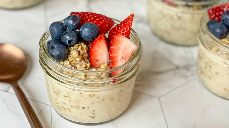 Once you finish mixing, cover the bowl, or get four airtight containers. Be sure to evenly divide the mixture into four equal portions. "When dividing this into individual portions, I love using mason jars as they are easy to grab on-the-go — plus, they look so pretty! However, any airtight containers will do, glass or plastic," MacLean shares. "I mixed everything in a large glass bowl and let that sit overnight before dividing it. However, this recipe can be divided into quarters in order to make the overnight oats directly in the jars, if that's preferred!"