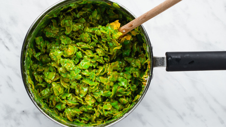 - Add the cornflakes to the pan, and stir until completely coated in the marshmallow mixture.