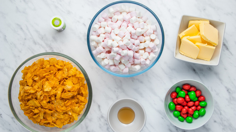 Ready to kick things off? If so, make a list of the ingredients you'll need to make these yummy wreaths. Start with butter, and then add mini marshmallows to your list. (Is it just us, or do mini marshmallows just make everything so much better?) Be sure to pick up vanilla extract and green food coloring as well. (If you have some at home already, the recipe just calls for a few drops of food coloring!) Then, pick up M&Ms or any other red candies for the wreaths' "ornaments," and of course, don't forget the cornflakes.