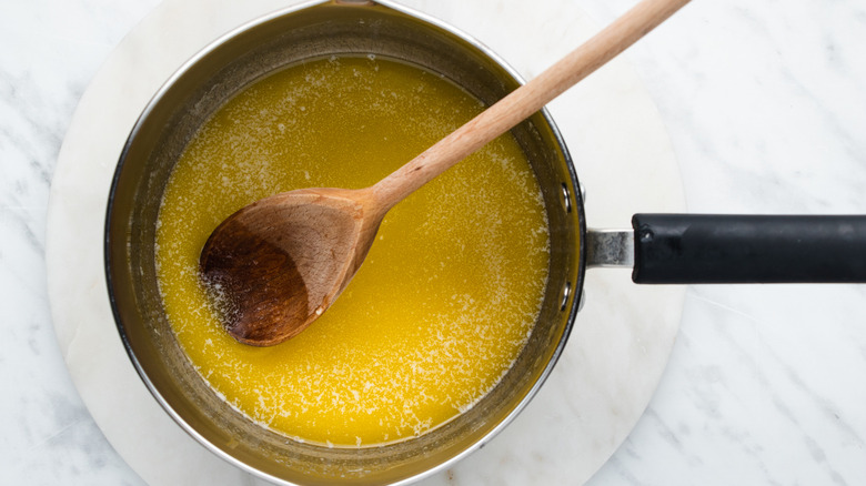 In the meantime, take out a large saucepan, and place it on the stove. Turn the heat up to medium-low, and toss in the butter. Let it cook until it's melted. "I'd say about three to four minutes. Just make sure to keep the heat fairly low so it doesn't burn," Brookes remarks about melting the butter.