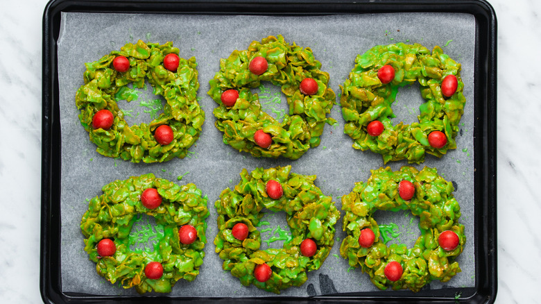Now that you have all of your ingredients ready to roll, grab two baking sheets, and line them with parchment paper. Surprisingly, you don't need to use an oven for this recipe, but the baking sheets come in handy for placing the finished wreaths on.