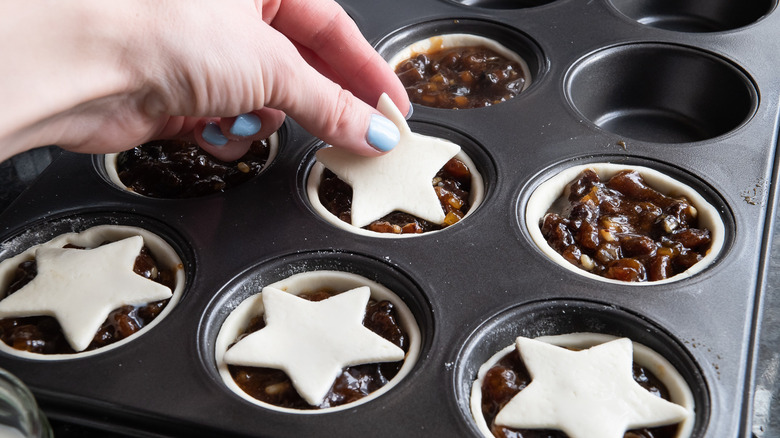 You should have a little bit of remaining pastry left. Roll it out as you did before, and then cut out star shapes, and place the pastry star on top of each pie. "There are lots of different ways to top a mince pie — some people just leave them open with no pastry topping, [while other] people put another circular layer of pastry on top so that the filling is entirely encased in pastry," Rye shares. "If you have different shaped pastry cutters, those are also options. You can really get as creative as you'd like!"