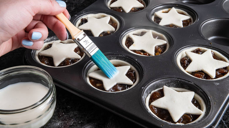 Once you have the toppers on the pies, take out your milk and a brush. Dip the brush into the milk, and brush a little bit on the top of each pie. "It's common to glaze mince pies with either egg or milk — they're interchangeable, really. Or, you can beat egg and milk together, and use that to glaze the pastry," Rye shares. "Milk tends to not give the same shine as egg glaze, but it can encourage browning. Honestly, I use it when I can, because it feels less wasteful to me than egg wash — especially when the pastry will be dusted with [powdered] sugar at the end, anyway."