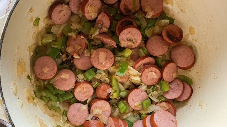 Next up, add the sliced sausage coins to the stock pot along with salt, pepper, and Creole seasoning. Carli uses Tony Chachere's Creole seasoning here, but you can easily use whatever brand you have on hand, or whichever one is your favorite. Be sure to sauté the sausage for about five minutes over medium heat. Carli advises that this step is crucial "to get a char on the sausage, which acts like a sear". Because this recipe simmers so long after this step, we see her point.