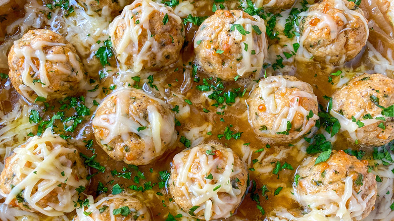 This French onion soup-esque recipe combines yummy grilled onions, Gruyere cheese, and fantastic chicken meatballs, making it both tasty and incredibly filling.
