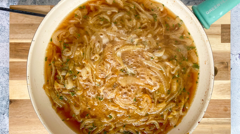 - Add the broth and thyme to the mix, and bring to a boil. Lower the heat to a simmer and cook for 5 to 10 minutes, until slightly thickened.