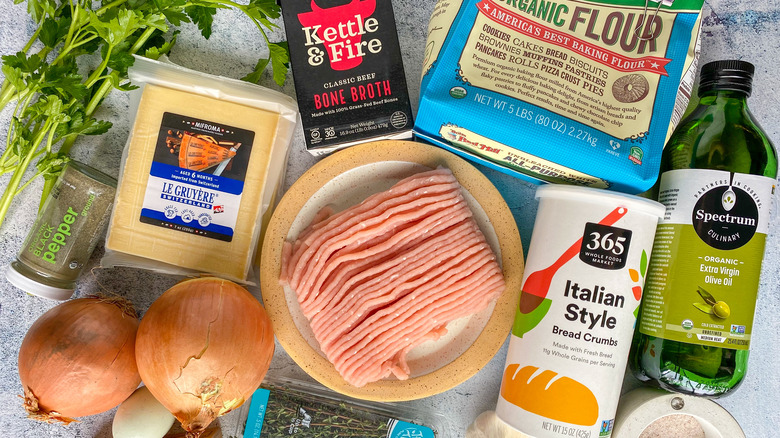 Once you commit to making this dish, it's time to take a trip to the grocery store. Just pick up a pound of ground chicken and then some shredded Gruyere cheese. You will also need to grab Italian breadcrumbs and fresh chopped parsley. Next, toss an egg and a few cloves of garlic into your cart. What recipe isn't better with garlic? The recipe also calls for a few commonly used ingredients like salt, pepper, and olive oil. You may have these ingredients at home already. You will also need a little butter, a couple of yellow onions, and all-purpose flour. Then, just get some beef broth and fresh thyme. That's all you need!