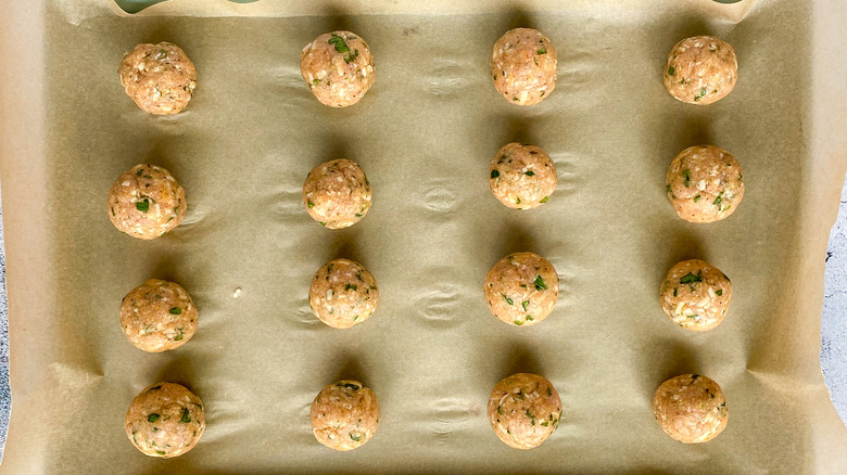 Now, take out a large bowl and toss in the ground chicken, followed by the Gruyere cheese. "Mozzarella is a great universally-liked cheese that is less earthy than the Gruyere, and it gives an excellent cheese-pull! A Swiss Emmental or provolone also would work great in this recipe," MacLean says of a sub for Gruyere. Next, add in the breadcrumbs, parsley, and egg. You can also throw in a few cloves of garlic, salt, and pepper at this time. Stir everything to combine it well. Using your hands, form the chicken mixture into balls. You should be able to make 16 meatballs total. Place the rolled meatballs on the prepared baking sheet and bake for 18 to 20 minutes. You can also check for an internal temperature of 165 F.